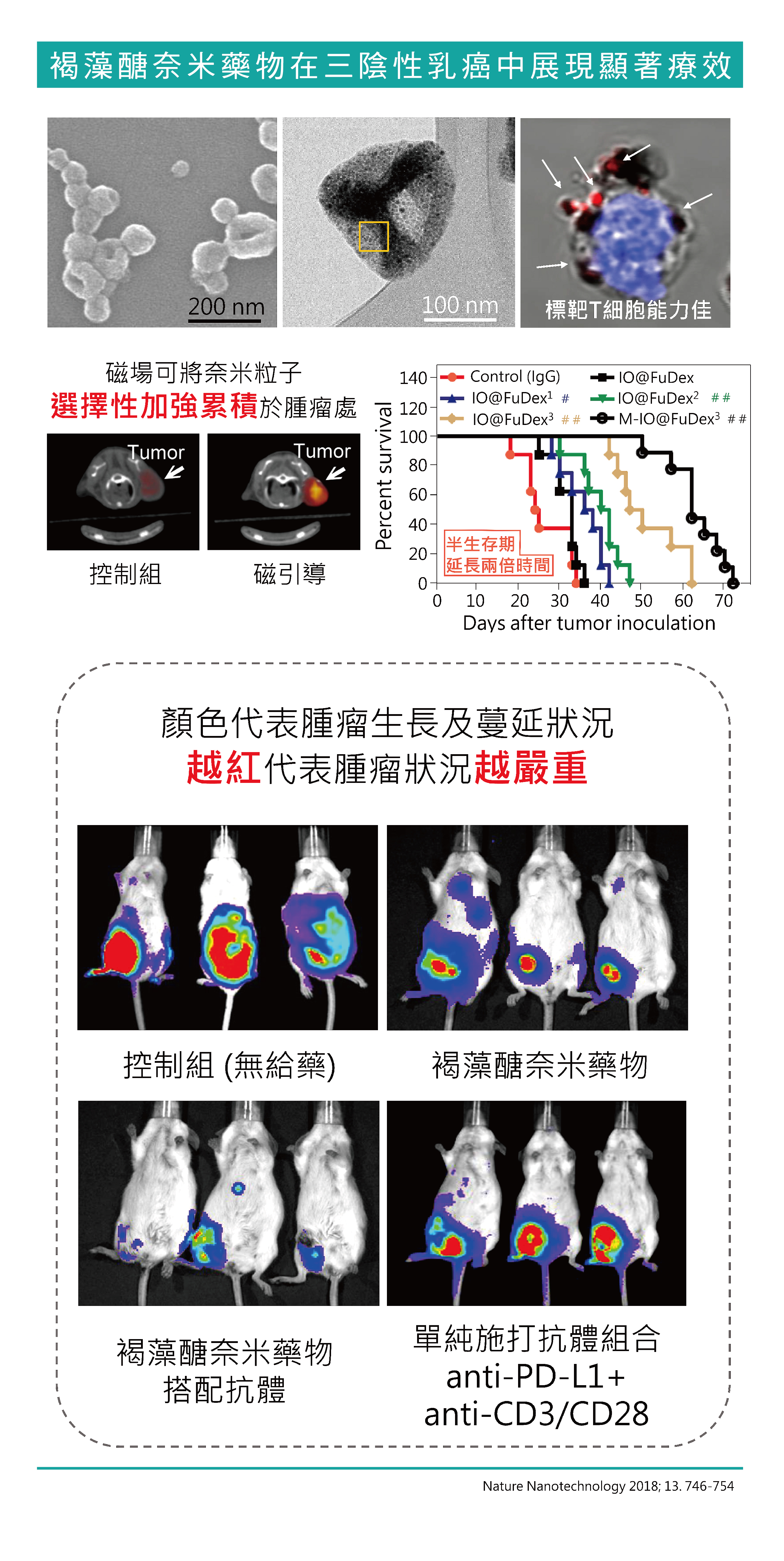 免疫療法是目前被看好能終結癌症的醫療方式,根據《Nature Review》的研究報告預估,2024年後免疫療法,會成為最主要的癌症治療策略,將佔腫瘤醫藥市場60%以上。但只有部分病患有療效,而含有免疫檢查哨抑制劑會影響免疫系統,使免疫細胞除了攻擊癌細胞以外,也會產生胃腸潰瘍、皮膚潰爛等自體免疫反應。為了提升免疫調節療法的療效及免除副作用,為此,本團隊以奈米科技為主軸,開發出具有免疫調節功能的磁性褐藻醣奈米平台式技術。此技術同時包含免疫檢查哨抑制劑及免疫細胞治療的優勢,不但能夠在直接注射後,有效增加腫瘤中的免疫細胞,更能夠將藥物精準的送達腫瘤,保持免疫細胞的活化,大幅提高療效。